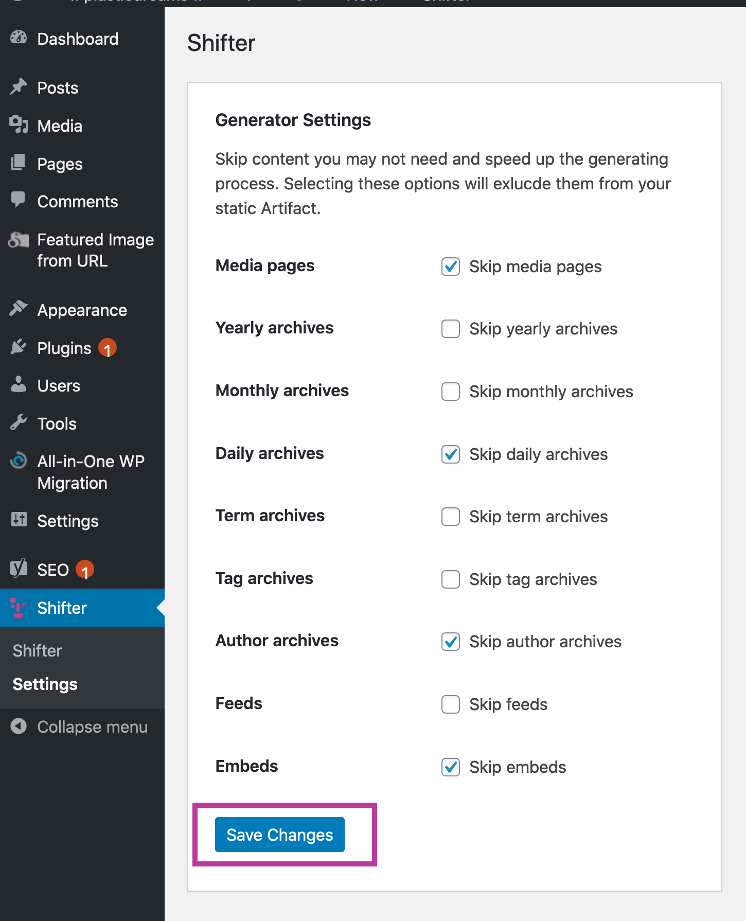 To control those options, start WordPress and navigate to the Shifter settings panel.